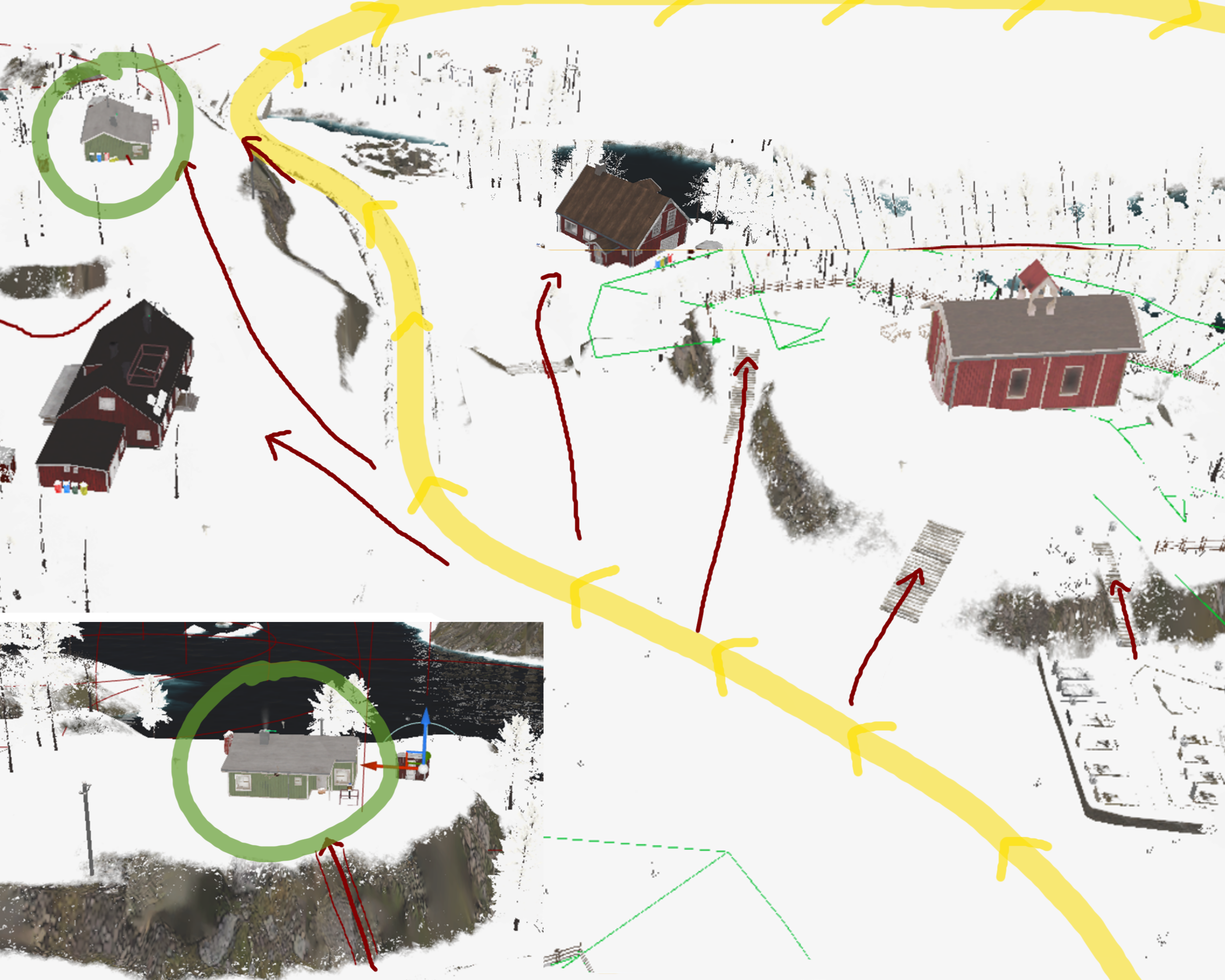 Implemented a main route using Unreal Engine’s spline tool, with short branching paths to encourage exploration and discovery.